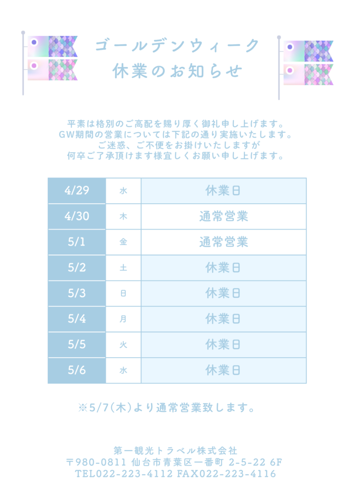 【ゴールデンウィーク期間のお知らせ】
